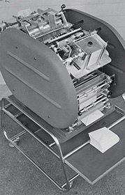 "1947 habe ich mit meiner Frau an der Hünigenstrasse in Konolfingen eine kleine Werkstätte eingerichtet, mit dem Ziel, mich selbständig zu machen. Zwei Jahre vorher war ich als technischer Leiter für eine italienische Druckmaschinenfabrik in Brüssel tätig und kam frühzeitig mit der Materie Papier in Berührung. Speziell in Druckereien sah ich manuell kuvertierte Briefpost, was mich zur Idee führte, eine Brieffalz- und Kuvertiermaschine zu konstruieren. Der Entwurf auf dem Papier führte später zum Bau des Prototyps"