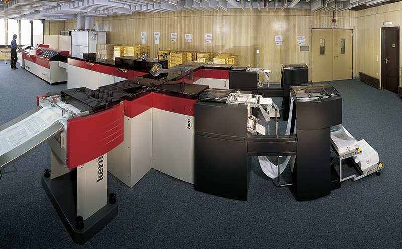Die ersten On-line-Anlagen werden gebaut. Das Schneiden, Falzen und Kuvertieren und Frankieren wird innerhalb eines Arbeitsganges durchgeführt. Die Kern AG baut ihre Führungsposition im Kuvertierversandbereich aus.