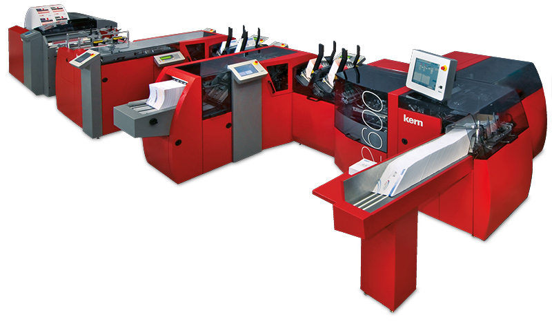 Weltpremiere des neuen kompakten Multiformat-Kuvertiersystem Kern 1600 [1] auf der drupa 2016 in Düsseldorf. Die Kern 1600 wurde für den unteren bis mittleren Leistungsbereich konzipiert und ist besonders für den Transaktions- und Direktwerbemarkt sowie für Lettershops einsetzbar.