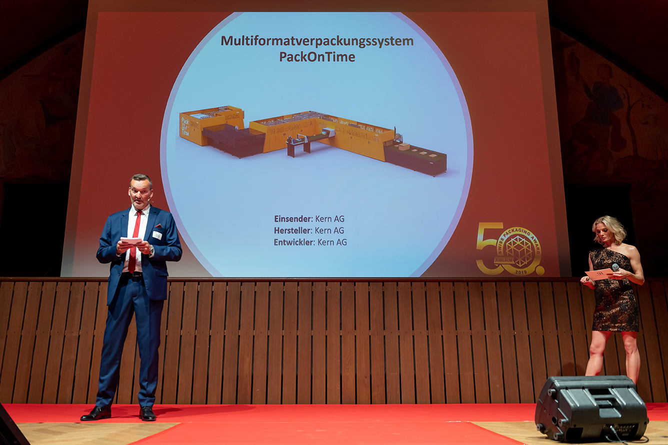 "…und die Gewinnerin in der Kategorie Technik ist die Kern AG". Die Kern AG konnte mit ihrem neu entwickelten Multiformat Verpackungssystem PackOnTime® die 15-köpfige Fachjury ökonomisch und ökologisch überzeugen und gewann eines der begehrten "goldenen Eier".