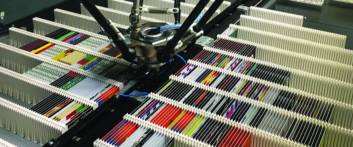 Cards are placed in the system and based on the file input to the card sorter, robotic arms stack the cards accordingly in groups so they are arranged in the correct order every time without a risk of human error.