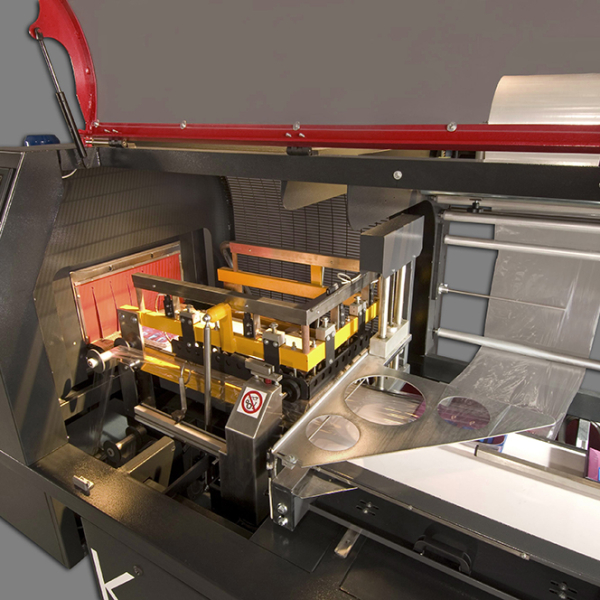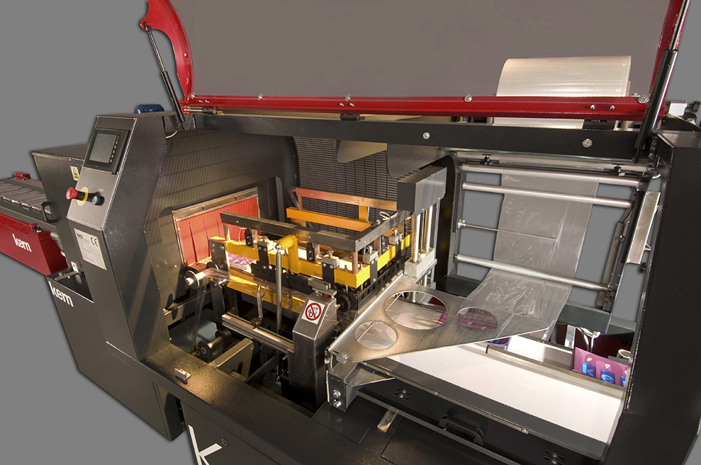 The K40-1 processes folded film. Packages are sealed by means of an L-shaped sealing device. The K40-1 is an entry-level poly wrapper that can be used to wrap individual books, stacks of publications, and packages. The system is equipped with a shrinking tunnel. It can operate independently, or serve as the end module of a bindery line.