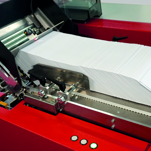 (14" para aplicaciones de plegado) - Velocidad: hasta 22.000 sobres por hora.