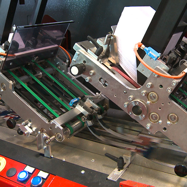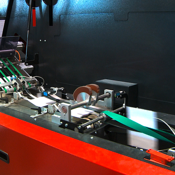 Pour permettre le placement de plusieurs cartes dans des plis comprenant plusieurs pages, la solution peut accepter divers alimenteurs de documents et d’encarts, ainsi que des modules de regroupement et de pliage. La Kern 90 a été conçue pour s’interfacer avec les solutions de mise sous pli Kern.